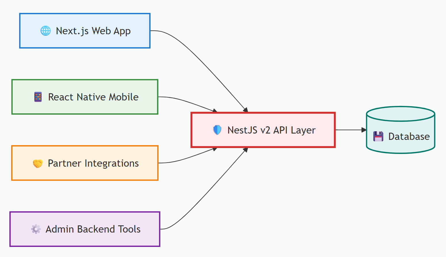 One backend powering Next.js Web, React Native mobile, internal tools, and future integrations